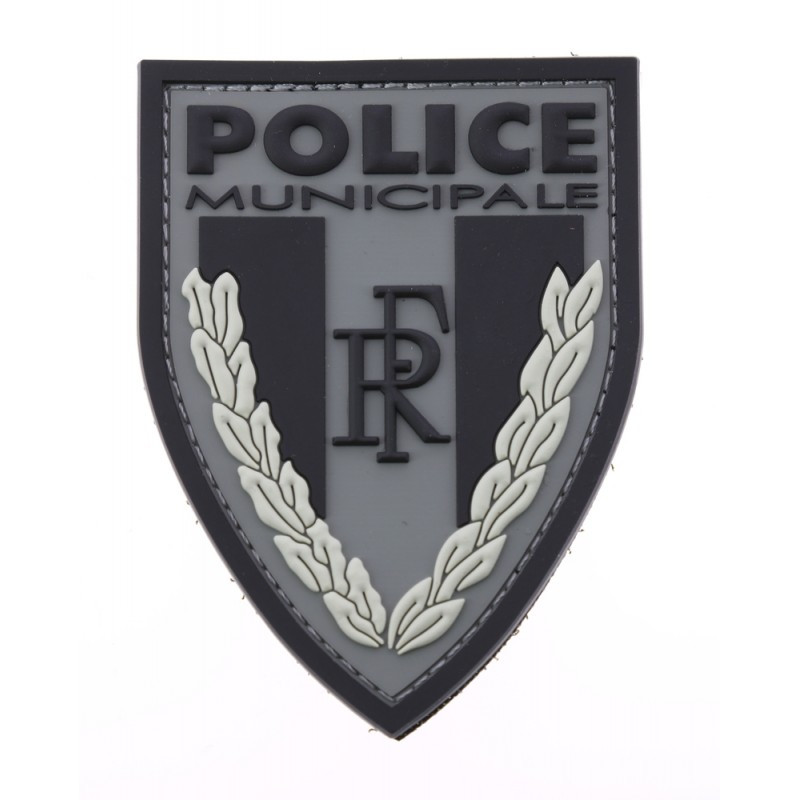 Ecusson de bras POLICE MUNICIPALE RF en gomme PVC avec inscription relief sur fond gris monté sur velcro crochet.