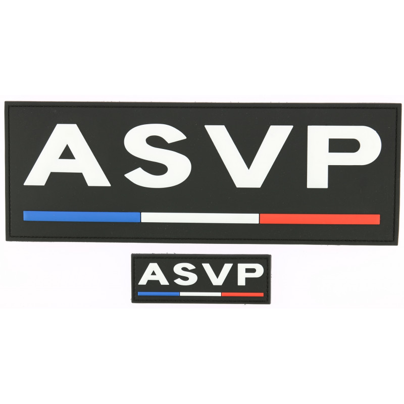 Découvrez ce jeu de bandeaux poitrine et dos pour les ASVP en gomme PVC: lettrage blanc sur fond noir avec un liseret tricolore au bas de chaque bandeau.