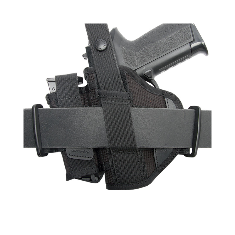 Capable d’accueillir un pistolet automatique large et un chargeur ou une lampe, conçu en cordura résistant et bien assemblé, monté avec des passants garantissant un parfait maintien de l’étui.