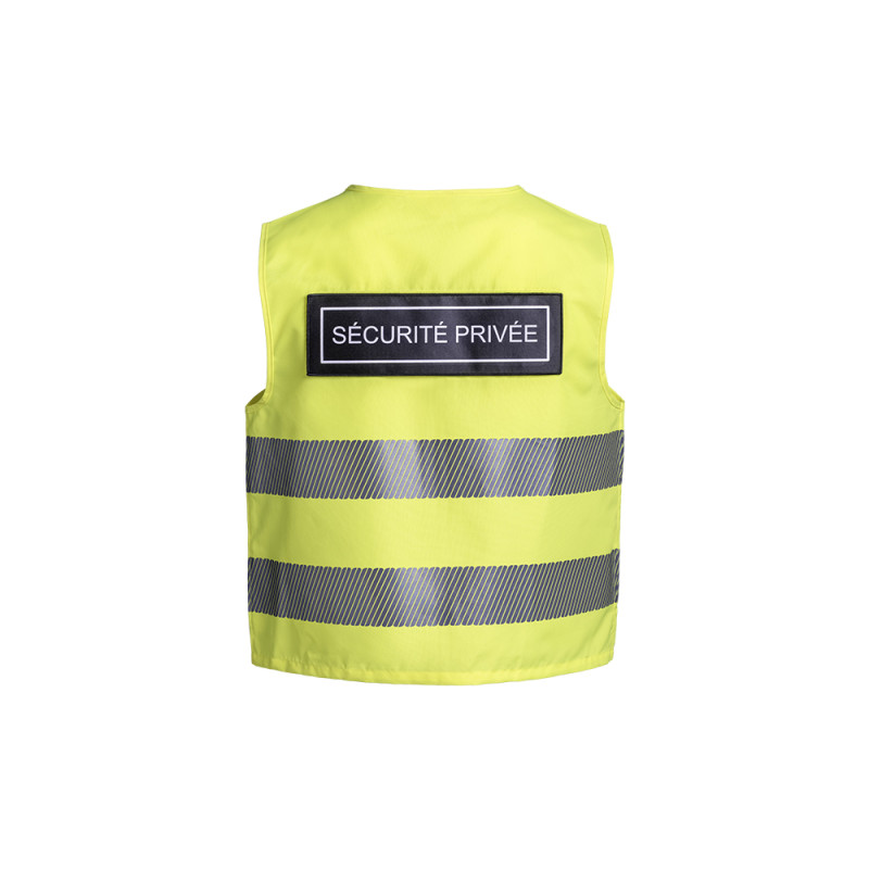 Professionnels de la Sécurité Privée, restez toujours visibles et identifiés avec ce gilet haute visibilité jaune et son marquage gris rétro-réfléchissant SÉCURITÉ PRIVÉE sur flaps amovible face et SÉCURITÉ PRIVÉE en arial 76 blanc rétro-réfléchissant sur fond noir sur dos.