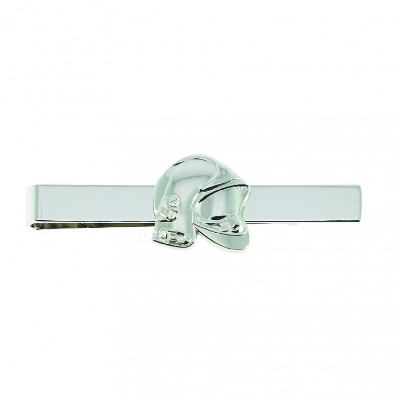Pince à cravate Sapeurs Pompiers en métal chromé argent avec un casque F1 en relief en son centre.