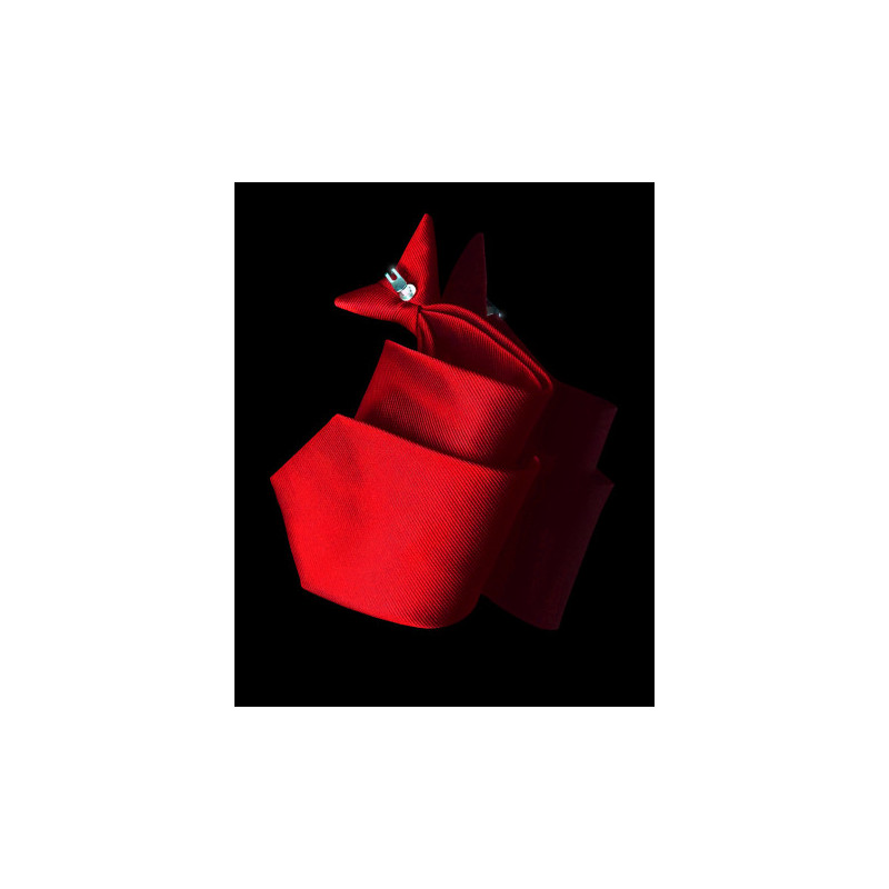 C'est d'abord une belle cravate rouge avec un système de clip qui se loge dans la boutonnière du col de la chemise.