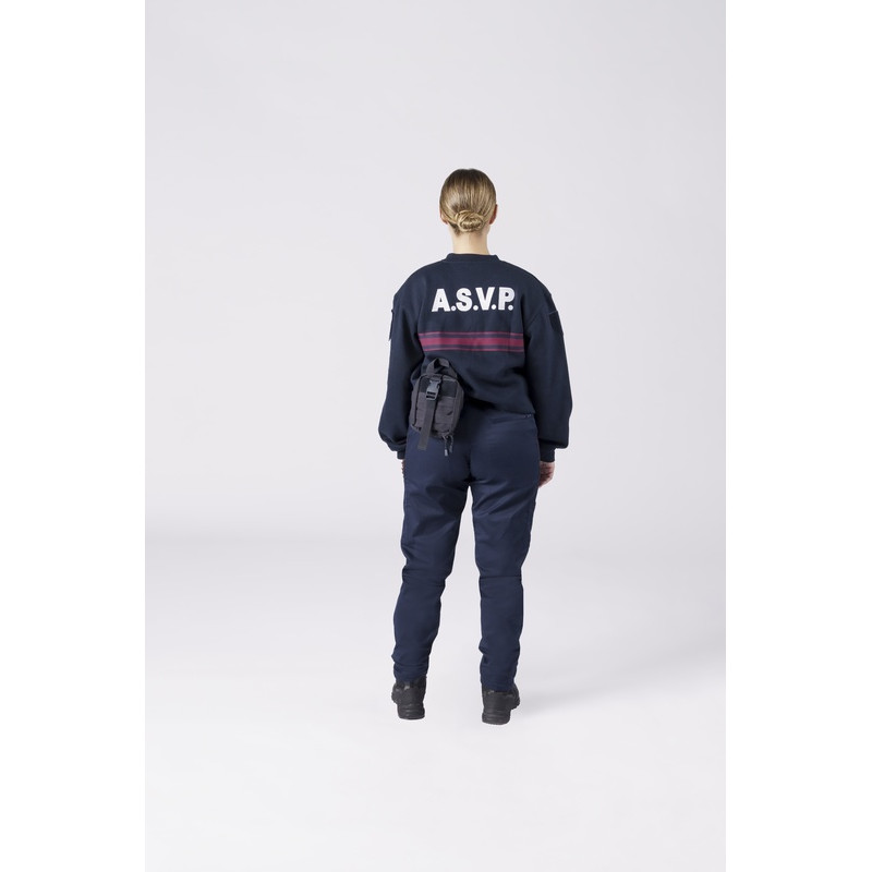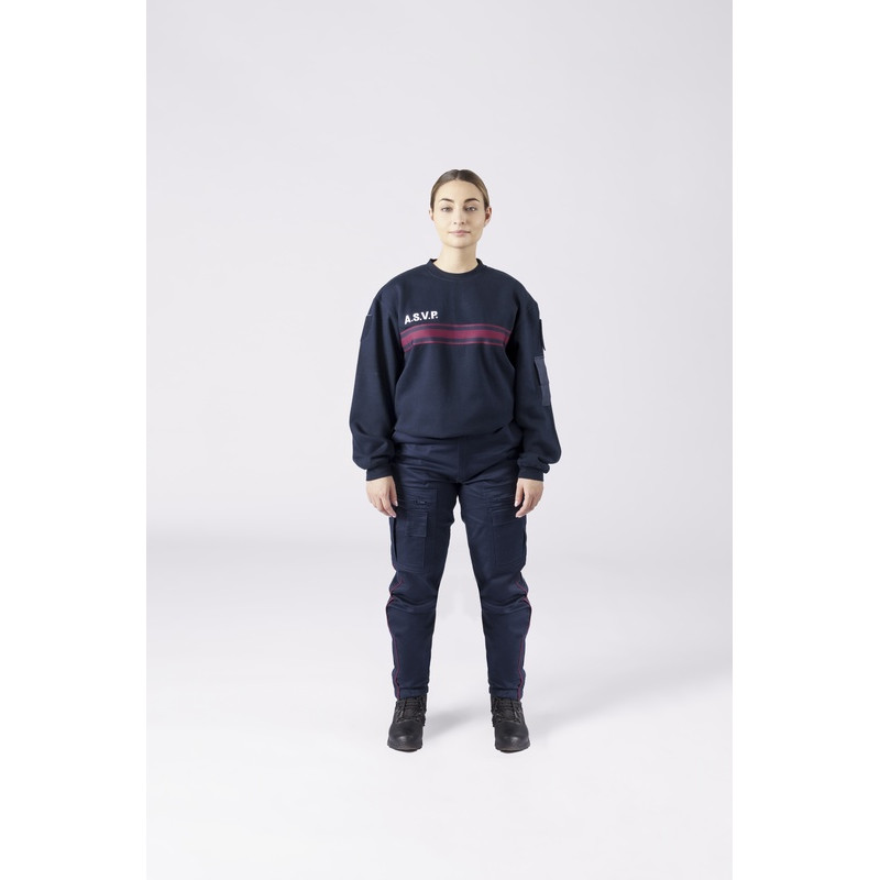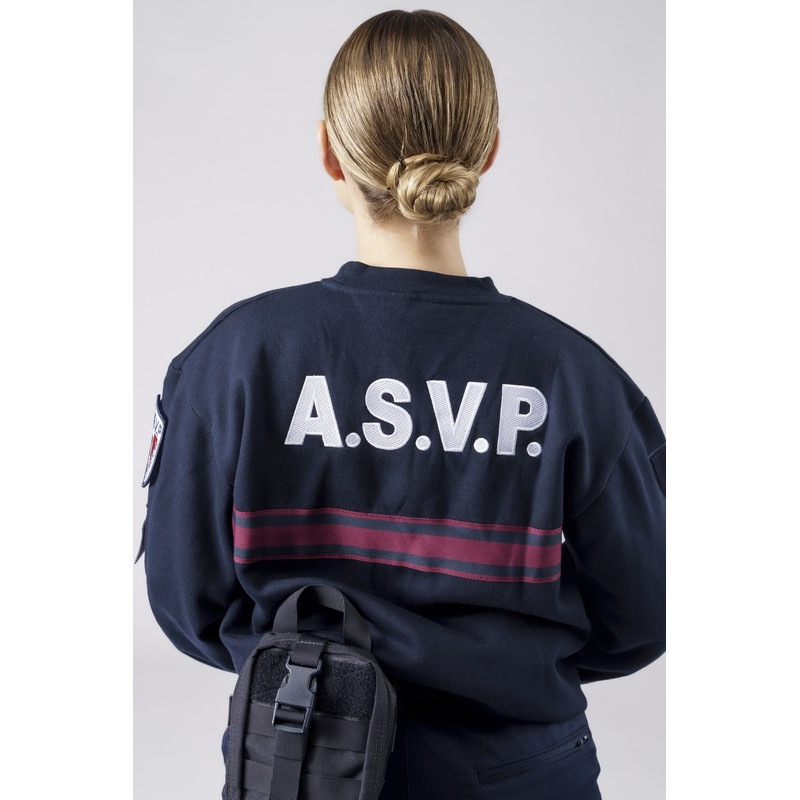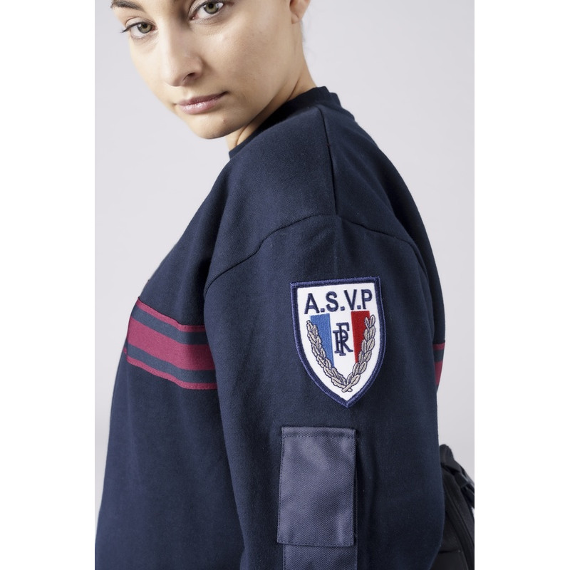 Commandez vite ce sweat-shirt ASVP marine bandes bordeaux col rond avec ses renforts épaule et coude, sa poche stylo sur manche gauche portée et ses supports auto-agrippants réglementaires.