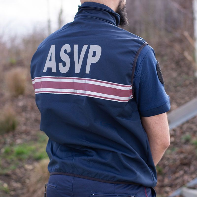 Pour garantir la visibilité et la sécurité de l’agent, le blouson est doté de bandes rétro-réfléchissantes avec un motif distinctif trois bandes bordeaux. La sérigraphie rétro-réfléchissante « ASVP » apposée sur la poitrine et dans le dos renforce l’identification immédiate du porteur, gage de professionnalisme et d’autorité.