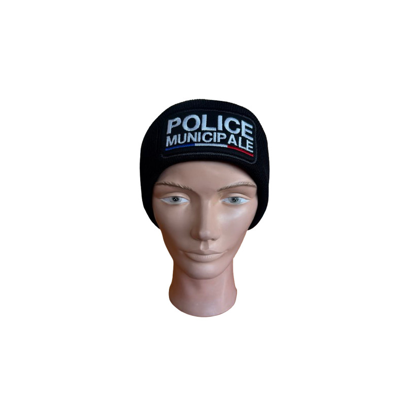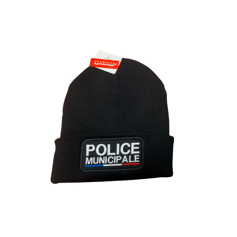 Bonnet 100% acrylique noir - 340 g/m2 avec broderie POLICE MUNICIPALE en fil blanc et liseré tricolore.